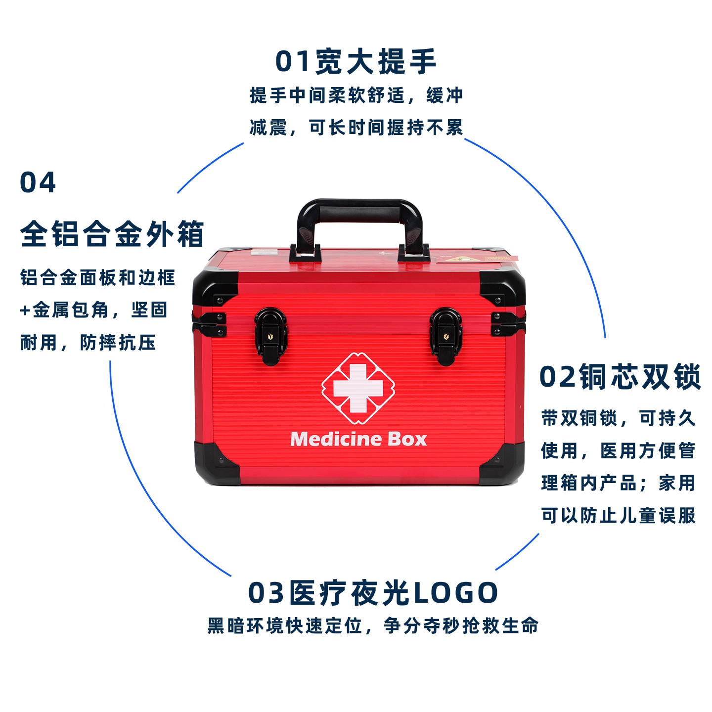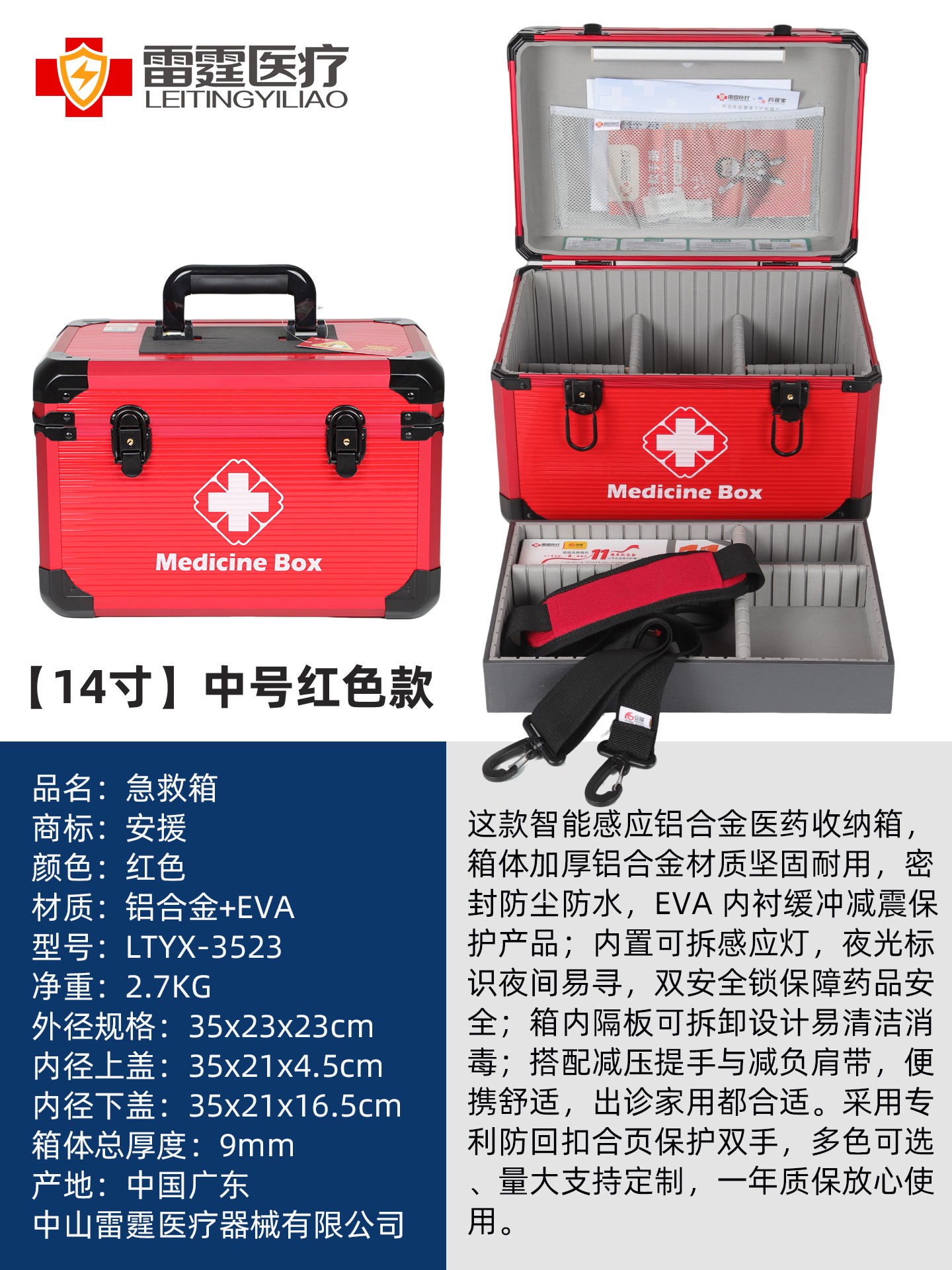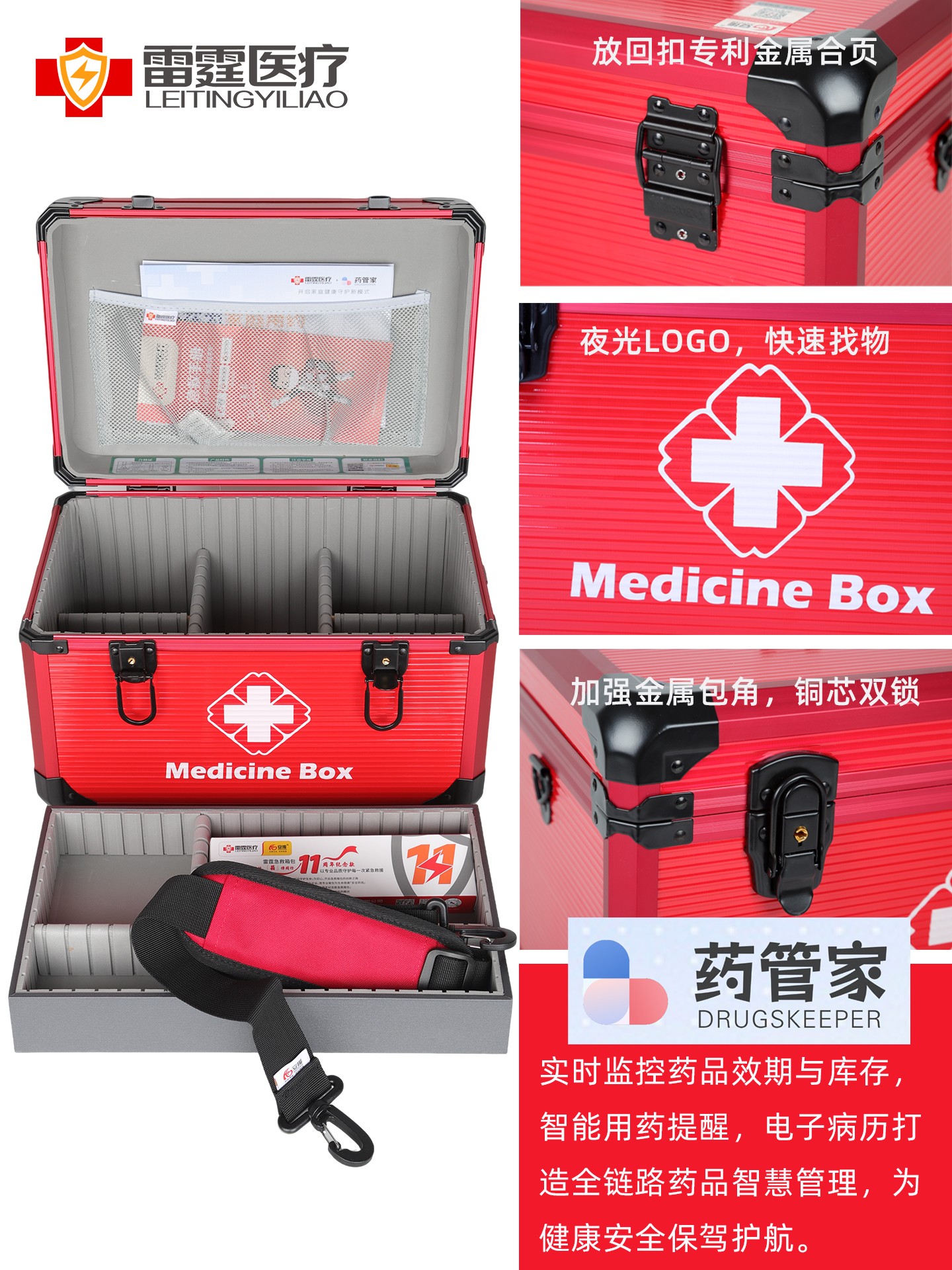 1.箱体及边框都采用铝合金材质,箱体含内衬总厚度不小于9MM,出色的强度和耐用性,能够经受长时间和频繁的使用而不易变形或损坏。 2.良好的防护性:铝合金出诊箱具有优良的密封性和防护性能,可以有效防止水、尘和其他外界物质的侵入,药箱内衬采用EVA材质,缓冲减震,保护箱内的医疗设备和药品免受损坏。 3.内置感应灯,在光线不足的环境下打开药箱会自动亮灯,方便取用产品,感应灯也可以拆卸下来用于查体等,方便临床使用。 4.整洁和易于清洁:铝合金出诊箱具有光滑的表面和可拆卸的内部隔层,使其易于清洁和维护。用户可以方便地擦拭和消毒,保持箱内的设备和物品的卫生和整洁。 5.外箱医疗十字标LOGO夜光标识,便于在夜间迅速找到药箱。 6.双安全锁和便捷设计:铝合金出诊箱配备有双安全锁和可靠的密封装置,保证箱内的医疗设备和药品的安全性。同时,它还具有便捷的开启和关闭设计,使用户可以快速取用所需的物品。 7.箱内分类隔板可以按需拆卸调节使用,方便分类和整理,使急救用品更加有序和便于取用。 8.减压便携:配置减压提手和可调节长度及可单肩斜挎的减负肩带,方便出诊携带。 9.品质配置,质量安心:医药箱采用一线医疗器械品牌配置,确保产品的安全使用,提供有多种不同的配置可供不同需求的选择,并可按需定制装配。 10.质保一年:正常使用一年内产品质量问题免费返厂维修或更换。