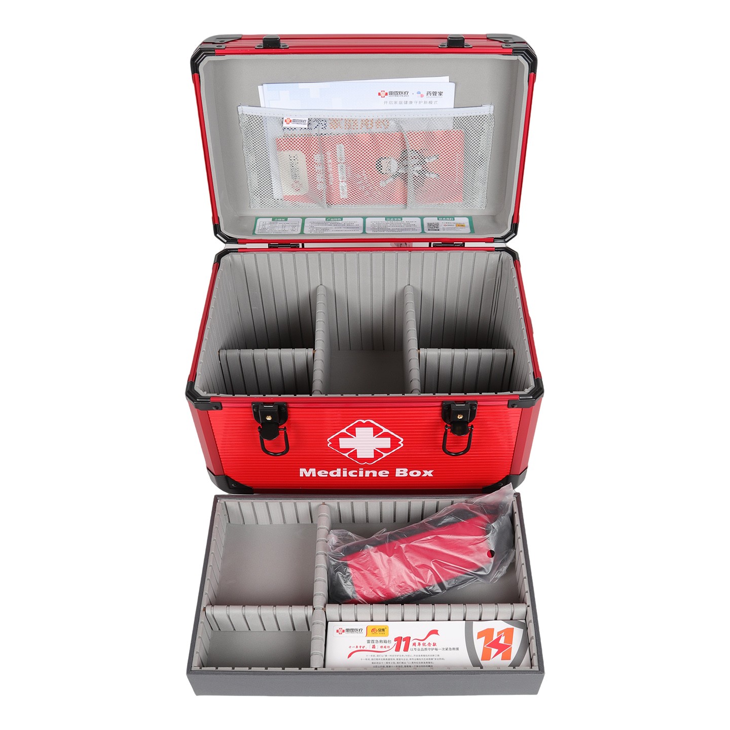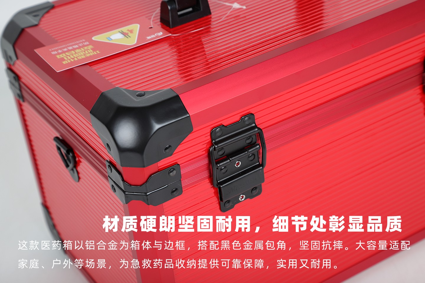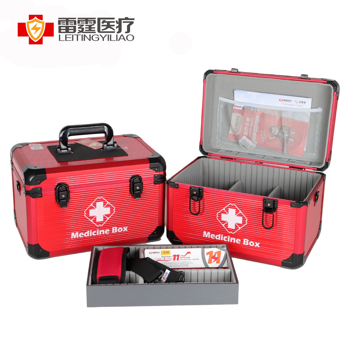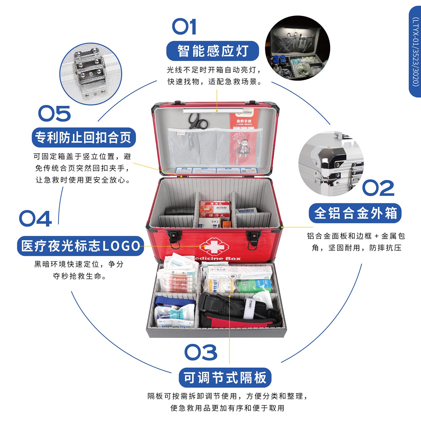 1.箱体及边框都采用铝合金材质,箱体含内衬总厚度不小于9MM,出色的强度和耐用性,能够经受长时间和频繁的使用而不易变形或损坏。 2.良好的防护性:铝合金出诊箱具有优良的密封性和防护性能,可以有效防止水、尘和其他外界物质的侵入,药箱内衬采用EVA材质,缓冲减震,保护箱内的医疗设备和药品免受损坏。 3.内置感应灯,在光线不足的环境下打开药箱会自动亮灯,方便取用产品,感应灯也可以拆卸下来用于查体等,方便临床使用。 4.整洁和易于清洁:铝合金出诊箱具有光滑的表面和可拆卸的内部隔层,使其易于清洁和维护。用户可以方便地擦拭和消毒,保持箱内的设备和物品的卫生和整洁。 5.外箱医疗十字标LOGO夜光标识,便于在夜间迅速找到药箱。 6.双安全锁和便捷设计:铝合金出诊箱配备有双安全锁和可靠的密封装置,保证箱内的医疗设备和药品的安全性。同时,它还具有便捷的开启和关闭设计,使用户可以快速取用所需的物品。 7.箱内分类隔板可以按需拆卸调节使用,方便分类和整理,使急救用品更加有序和便于取用。 8.减压便携:配置减压提手和可调节长度及可单肩斜挎的减负肩带,方便出诊携带。 9.品质配置,质量安心:医药箱采用一线医疗器械品牌配置,确保产品的安全使用,提供有多种不同的配置可供不同需求的选择,并可按需定制装配。 10.质保一年:正常使用一年内产品质量问题免费返厂维修或更换。