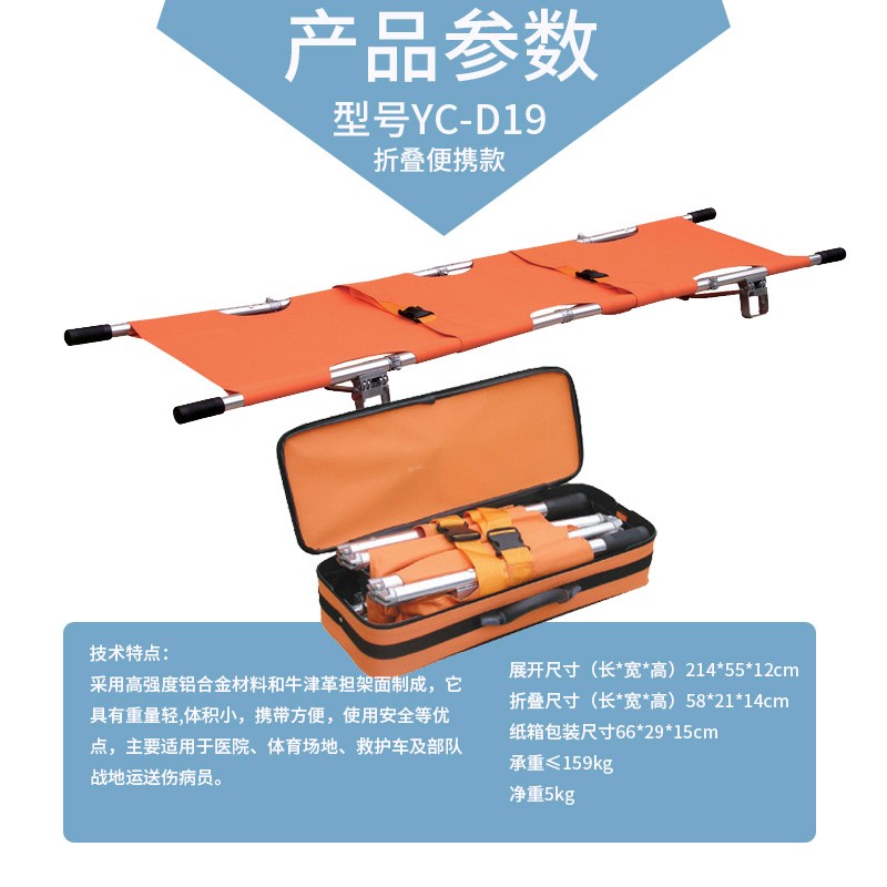 技术特点: 采用高强度铝合金材料和牛津革担架面制成,它具有重量轻,体积小,携带方便,使用安全等优点,主要适用于医院、体育场地、救护车及部队战地运送伤病员。 型号YC-D19 展开尺寸(长*宽*高)214*55*12cm 折叠尺寸(长*宽*高)58*21*14cm 纸箱包装尺寸66*29*15cm 承重≤159kg 净重5kg 毛重7kg