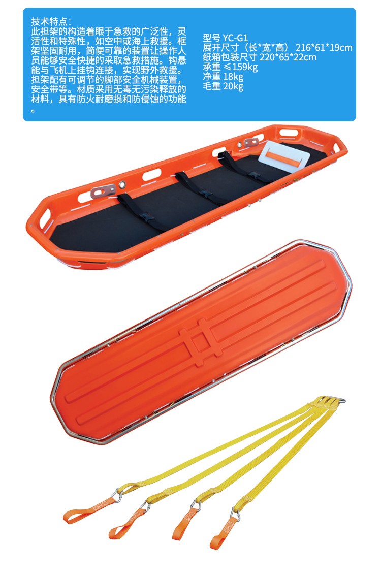 技术特点: 此担架的构造着眼于急救的广泛性,灵活性和特殊性,如空中或海上救援。框架坚固耐用,简便可靠的装置让操作人员能够安全快捷的采取急救措施。钩悬能与飞机上挂钩连接,实现野外救援。担架配有可调节的脚部安全机械装置,安全带等。材质采用无毒无污染释放的材料,具有防火耐磨损和防侵蚀的功能。 型号 YC-G1 展开尺寸(长*宽*高) 216*61*19cm 纸箱包装尺寸 220*65*22cm 承重 ≤159kg 净重 18kg 毛重 20kg