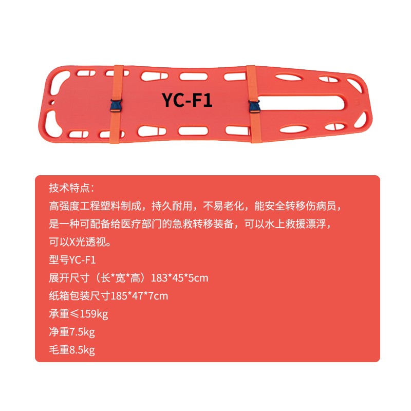 技术特点:高强度工程塑料制成,持久耐用,不易老化,能安全转移伤病员,是一种可配备给医疗部门的急救转移装备,可以X光透视。型号YC-F1展开尺寸(长*宽*高)183*45*5cm纸箱包装尺寸185*47*7cm承重≤159kg净重7.5kg毛重8.5kg
