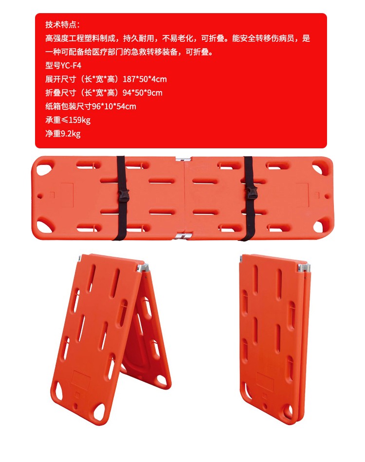 技术特点:高强度工程塑料制成,持久耐用,不易老化,可折叠。能安全转移伤病员,是一种可配备给医疗部门的急救转移装备,可折叠。型号YC-F4展开尺寸(长*宽*高)187*50*4cm折叠尺寸(长*宽*高)94*50*9cm纸箱包装尺寸96*10*54cm承重≤159kg净重9.2kg毛重10.5kg