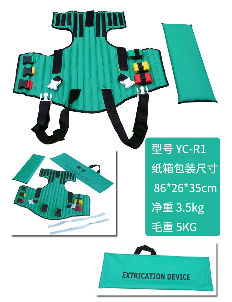 技术特点:1.绿色担架非常适用于交通事故解救中的颈椎和脊椎固定。2.绿色担架内部装有硬质的用于脊椎固定的板,外面覆盖结实3.耐用的尼龙材料,不但可以有效地固定脊椎而且令病人感到舒适;4.外覆的尼龙材料非常易于清洁与保养;5.绿色担架上配有按颜色标识的可以快速解开的卡锁式绑带,6.在光线暗淡的狭窄的困难环境下也可以方便快速的使用;7.在把病人运送到全尺寸脊椎固定板上之前,可以配合颈托使用将病人坐姿固