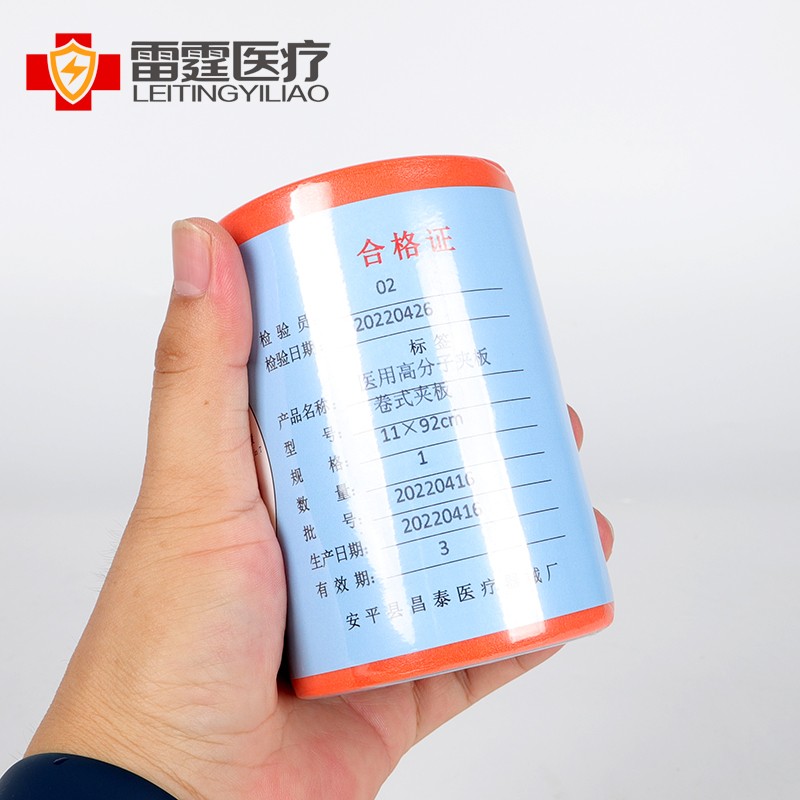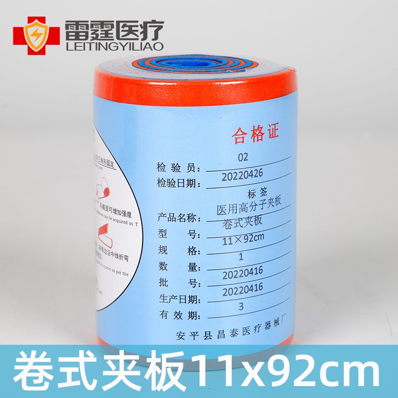 # 雷霆医疗医用高分子卷式夹板产品介绍雷霆医疗的医用高分子卷式夹板,由安平县昌泰医疗器械厂生产,型号为卷式夹板,规格11×92cm 。采用高分子材质,可塑型强,能贴合肢体固定,适用于骨折临时固定、关节扭伤支撑等场景,为创伤急救与康复护理提供便捷、可靠的固定工具 。