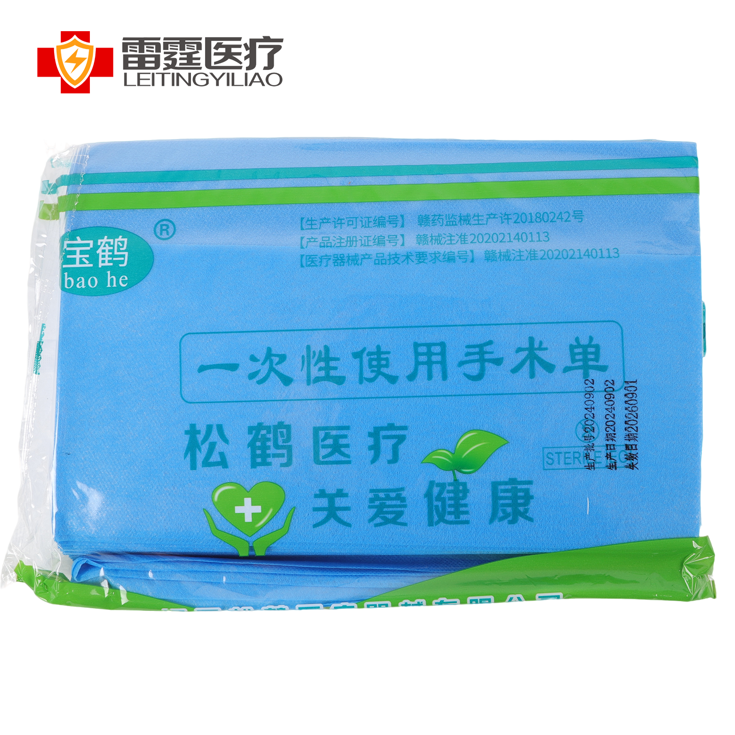 # 雷霆医疗一次性使用手术单雷霆医疗旗下“宝鹤”品牌一次性使用手术单,由松鹤医疗关联生产,产品经严格审批,持有【生产许可证编号】赣药监械生产许20180242号 、【产品注册证编号】赣械注准20202140113 等资质 。 采用灭菌处理,防水、防渗漏,单张独立包装,使用便捷,适配手术、检查等场景,有效隔离污染,为医疗操作提供清洁、安全的基础保障,以“关爱健康”理念,守护诊疗环境 。