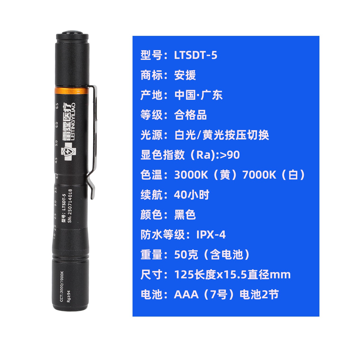 五代款手电筒参数: 合格证 型号:LTSDT-5 商标:安援 产地:中国·广东 等级:合格品 光源:白光/黄光按压切换 显色指数(Ra):>90 色温:3000K(黄)7000K(白) 续航:40小时 颜色:黑色 防水等级:IPX-4 重量:50克(含电池) 尺寸:125长度x15.5直径mm 电池:AAA(7号)电池2节