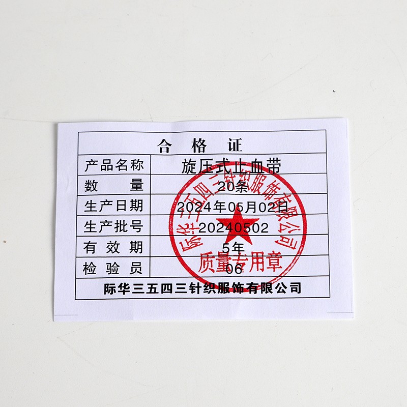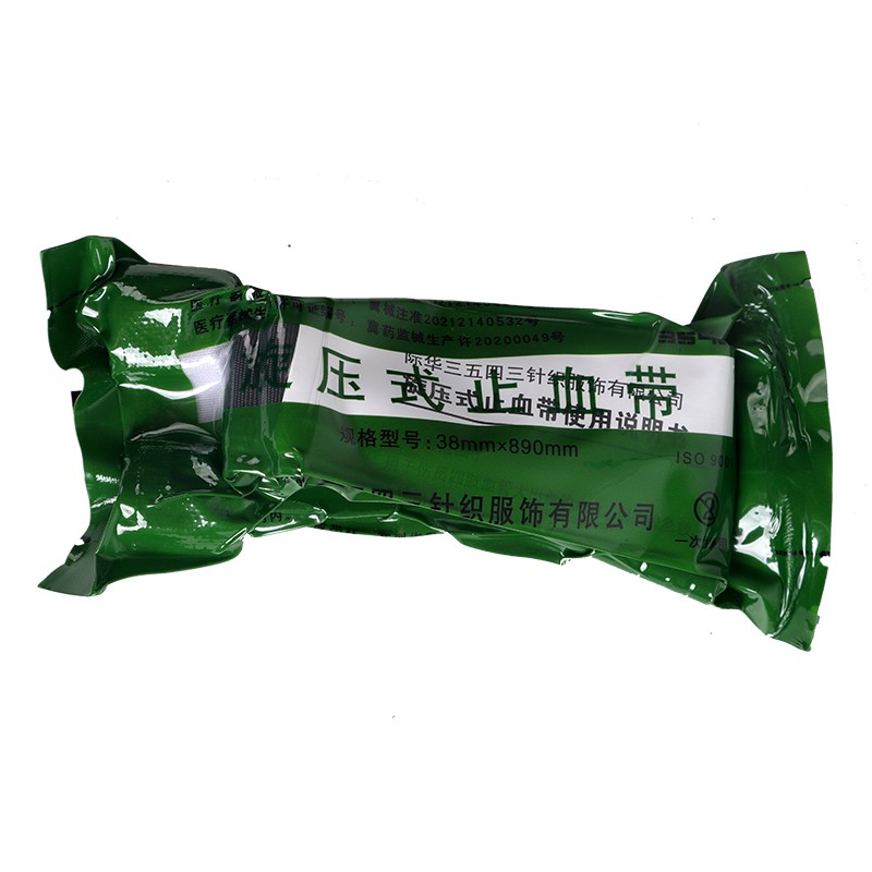 # 旋压式止血带产品介绍 此为旋压式止血带,由际华三五三四针织服饰有限公司生产,规格型号38mm×890mm ,具备生产备案凭证等资质 。 采用旋压设计,操作简便,可快速对肢体加压止血,适用于户外急救、战场救护及临床创伤止血场景,通过调节旋压部件精准控制压力,有效阻断血流,为创伤救治争取时间,是应急止血的实用工具,助力保障生命安全 。